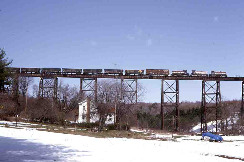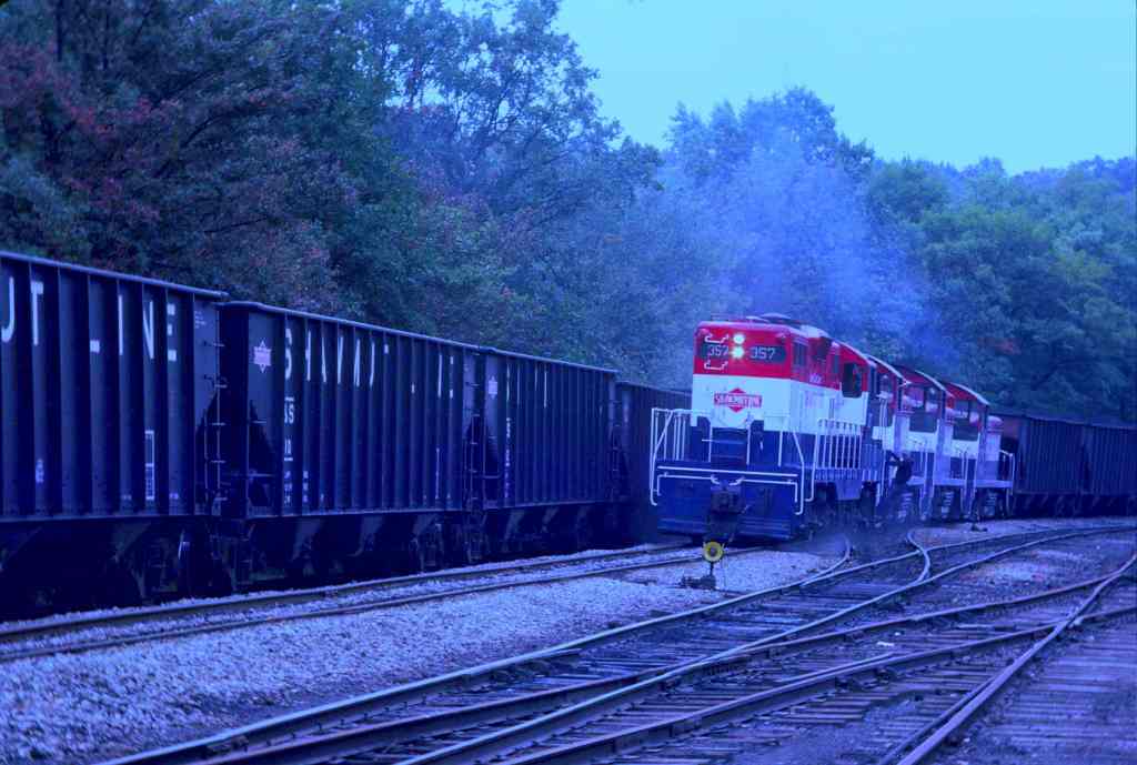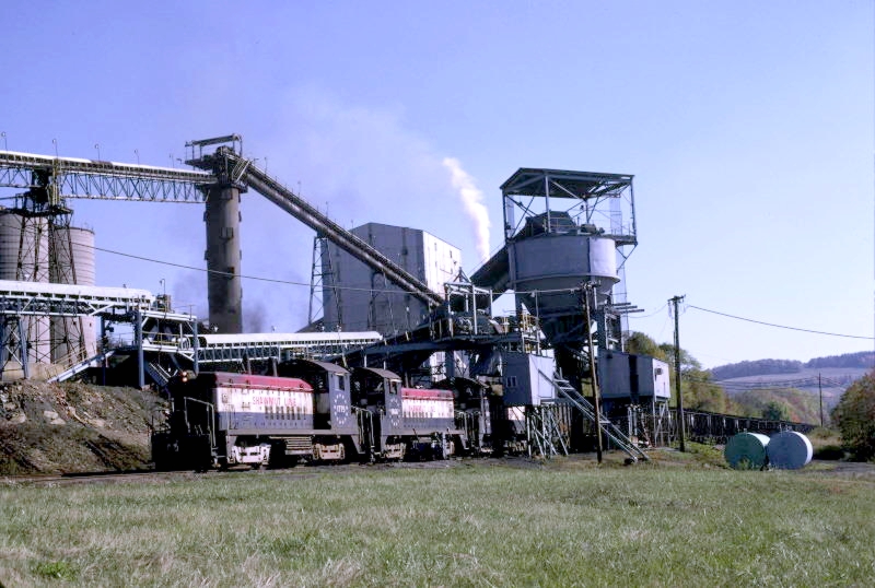 Since the P&S was a coal hauling line, let David Baer take you back to October 1995 where BVL1 was working the coal loader at Dora!! John caught three P&S SW9’s at MP1 Lawsonham. Sprankle Viaduct 1994Northbound at Freeport 1993Dora Coal Processing Plant with five Mountain Laurel GP10’sWest Penn Power Plant Reesedale 1994In 1984 a northbound local works the coal loader at Timblin in this John Murray photo. Andy Hepp sent this view of Brookville in 2008, looks more like a Conrail yard! The 3013 isn’t going anywhere soon! I always liked this shot of the 237 at Markle from Kurt Reisweber since grandpa and I walked over this spot many times and the 237 is a bit odd with the word “AND” instead of the &. Here’s GP7 357 tied up at Applewold/Kittanning from Bob Schroyer in 1977. The 357 was a bit odd, had to either lead long hood forward or trail with the short hood to other power as the long hood didn’t have the proper cables.A great photo at West Mosgrove of a BPRR chugging along from Freddy Shook. The two tracks in the foreground where the P&S tracks at this interchange point and obviously at the top of quite a steep climb! Plenty of power on this one switching at “BV” including GP7 357! A nice look at the old and the new at Brookville! In the special section P&S engines in original and Bicentennial paint it was noted the 236 had the word “and” instead of the “&” between Pittsburg & Shawmut, found this rare look in my collectionof the 236 at “BV.”In August 1989, David Baer caught eastbound Conrail coal train UCI-275 crossing the Carrier Viaduct on Conrail’s Clarion Secondary, a former New York Central line. The coal train loaded at the mine at Piney. Conrail’s Clarion Secondary would become the Mountain Laurel’s Piney Line, when Conrail sold the line to the P&S. The Viaduct is just east of the Conrail and LEF&C interchange at Sutton, Pa. In March 1992, David caught this eastbound Mountain Laurel train also on the Carrier Viaduct powered by three P&S switchers. The ML train had picked up a train of empty LEF&C hoppers from the LEF&C interchange at Sutton and is heading toward Brookville. Note the SP box car behind the P&S switchers. It is loaded with bricks from an industry on the LEF&C.