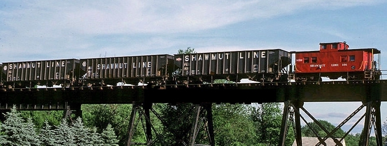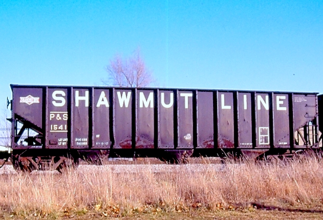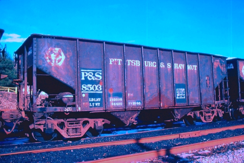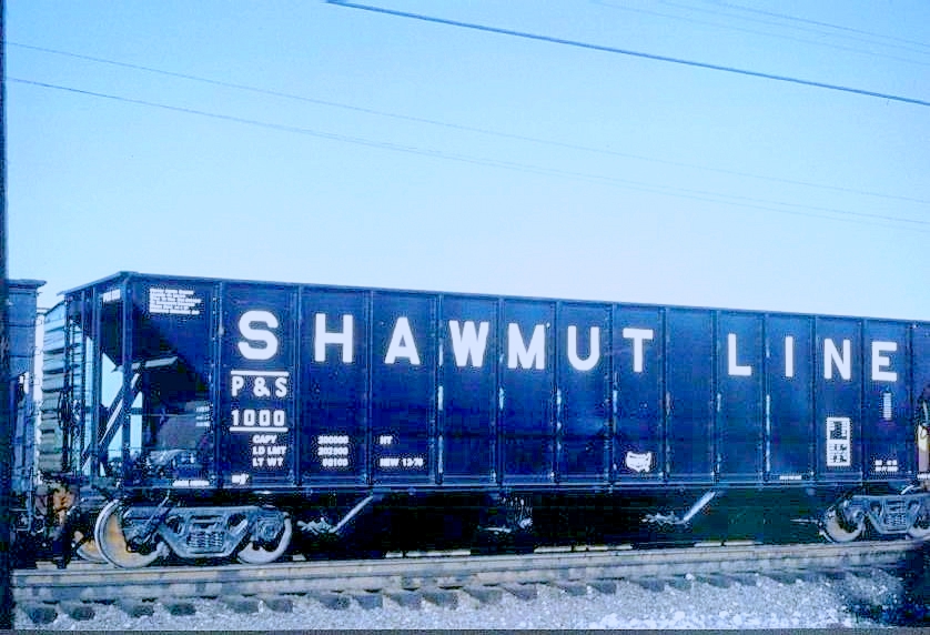 Here is a fine example of a Shawmut 55 ton hopper used for decades. The P&S also used hoppers from other railroads, Erie, etc. in earlier years, but from around the 1970’s until the end they mostly used their own coal hoppers.From 1954 in this Richard Cook photo at Markle is a good example of other railroad cars on the P&S. This new section will require further research, but here’s a cool example of the later years when the P&S started using 100 ton cars. There was a mix of logos and lettering. Some, not pictured here had Pittsburg & Shawmut in white letters in the upper area, then the P&S started using “SHAWMUT LINE.” The middle car’s lettering was lower here, the left car had the hexagon logo with white letters inside a black double arrow while the middle car had the hexagon logo with white double arrow and black lettering. The far right car had the red and white version of the former PS&N logo! Here’s a most interesting hopper, number 1000 with no logo! Perhaps a new car pressed into service and not finished! Former Frisco 55 ton hopper numbered PS45 was likely maintenance car for ballast.P&S hopper 1541 is a fine example of the typical coal hoppers used from the 1970’s until the end, of course cars like this appeared along with the SW9’s being repainted red, white, and blue for the 1976 Bicentennial celebration.